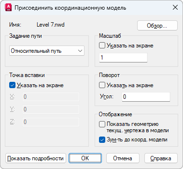 Определение места присоединения в чертеже точки вставки для координационной модели. По умолчанию установлен флажок "Указать на экране". Точкой вставки по умолчанию считается 0,0,0.