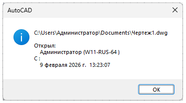 После указания файла чертежа отображается информация о файле, которая включает в себя полный путь к файлу, имя текущего пользователя, имя компьютера и дата и время, когда чертеж был открыт. Аналогичная информация автоматически отображается при попытке открытия файла чертежа, уже открытого другим пользователем.
