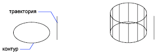 Задание траектории выдавливания на основе выбранного объекта. Траектория перемещается к центру тяжести профиля. Затем профиль выбранного объекта выдавливается вдоль выбранной траектории для создания тел или поверхностей.