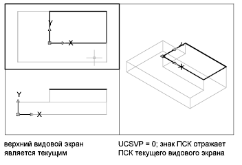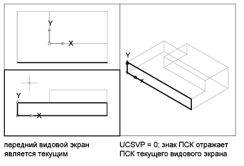 Всеми ПСК видовых экранов управляет системная переменная UCSVP, доступ к которой можно также получить с помощью команды "ДИСПСК" на вкладке "Параметры". На видовых экранах, где UCSVP равна 1, ПСК, использованная непосредственно перед переходом на другой видовой экран, запоминается; при возврате на данный видовой экран происходит ее восстановление. Если для видового экрана системная переменная UCSVP установлена равной 0, то ПСК этого видового экрана всегда совпадает с ПСК текущего активного видового экрана.