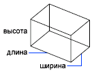 Построение ящика с заданными значениями длины, ширины и высоты. При вводе значений длина соответствует оси X, ширина - оси Y, а высота - оси Z. Выбор точки для указания длины задает также вращение в плоскости XY.