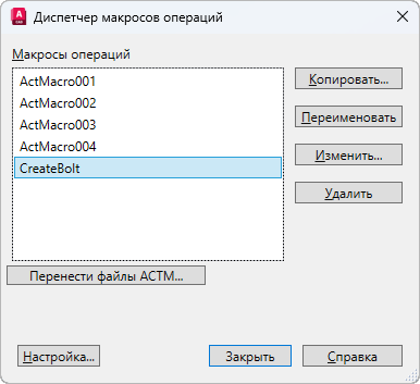 В окне Диспетчера макросов операций перечислены файлы записанных макросов операций (ACTMX).