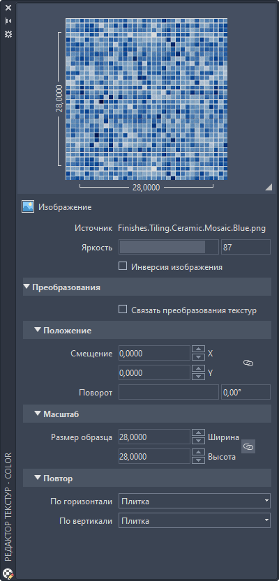Настройки текстуры управляют множеством свойств текстур, применяемых для материалов, включая положение, масштаб, размер и повторение. Некоторые настройки являются общими для нескольких текстур, другие уникальны для типа текстуры.