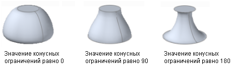 На следующей иллюстрации показан эффект использования различных углов граничных условий для первого и последнего поперечных сечений лофт-тела. Первому поперечному сечению назначен угол конуса величиной 45 градусов, а второму поперечному сечению — угол в 135 градусов.