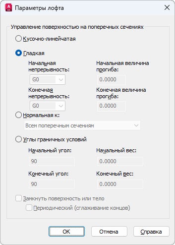 Указывает, что между поперечными сечениями строится сглаженное тело или сглаженная поверхность, имеющие острые кромки на начальном и конечном поперечных сечениях. LOFTNORMALS (системная переменная)