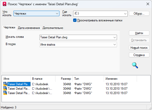 Тип содержимого для поиска. От типа содержимого, выбранного в списке "Что искать", зависит набор вкладок и полей поиска, отображаемых в диалоговом окне поиска. Вкладки "Дата изменения" и "Дополнительно" присутствуют в окне только в том случае, когда производится поиск файлов (чертежей, образцов штриховки и т.п.)