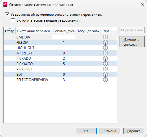 Отображение отслеживаемых системных переменных и их статуса, предполагаемых и текущих значений, а также доступ к отдельной теме справки по системным переменным.