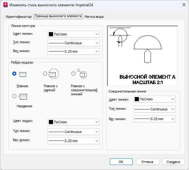 Определение свойств линии границы выносного элемента, ребра модели и соединительной линии выносных элементов.