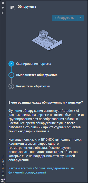Палитра «Обнаружение» предоставляет параметры для сканирования чертежа и просмотра выявленных объектов, которые можно преобразовать в блоки.