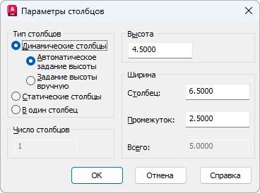 Управление отображением и заданием значений ширины столбцов и интервалов между столбцами. Значение интервала между столбцами в пять раз превышает значение высоты текста по умолчанию.