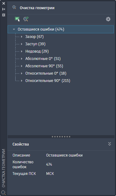 Отображение всех обнаруженных ошибок в текущем чертеже или наборе объектов, упорядоченных в виде дерева. Возможные типы ошибок: «Зазор», «Заступ», «Недовод», «Абсолютный угол» и «Относительный угол».