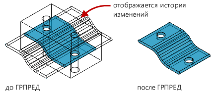 Удалить историю построения выбранного составного объекта можно путем задания для его свойства "Журнал" значения "Нет" или вводом команды ГРПРЕД. После удаления истории построения выбор и редактирование исходных и удаленных компонентов тела становятся невозможными. Повторно установить сохранение истории построения тела можно путем задания для его свойства "Журнал" значения "Записать".