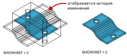 Форму составного объекта можно изменять путем редактирования выделенного каркасного изображения его исходных компонентов. Если для свойства "Показать журнал" установлено значение 1 (Вкл), то каркасы исходных форм, включая удаленные формы, отображаются в режиме затенения. (Также этой настройкой управляет системная переменная SHOWHIST.)