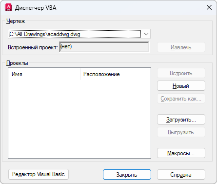 Вызов Редактора Visual Basic, который позволяет редактировать проекты VBA (модули, формы, ссылки), хранящиеся в открытом чертеже или загруженные в AutoCAD. Кроме того, с помощью редактора Visual Basic можно запускать и отлаживать проекты VBA.