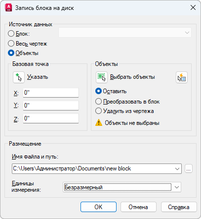 Задание нового имени и расположения файла, а также указание единиц измерения, используемых при вставке блока.