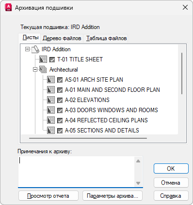 Список листов, включаемых в пакет архива, в том порядке, в котором они были созданы, и в соответствии со структурой группы. Подшивка должна быть открыта в "Диспетчере подшивок". Архивация может быть инициирована либо из контекстного меню, если правой кнопкой мыши щелкнуть элемент подшивки верхнего уровня, либо путем ввода в командной строке команды АРХИВАЦИЯ.