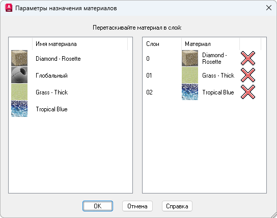 Вывод списка всех слоев в чертеже и во всех внешних ссылках, назначенных чертежу. Миниатюра материала показывает, какой материал был назначен слою. Для открепления материала от слоя нажмите кнопку "Отключить" (значок X).