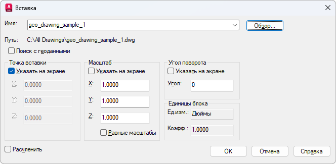Вставка чертежа с использованием географических данных в качестве ссылки.
