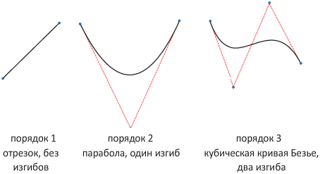 Кривая 1-го порядка является прямой линией, а кривая 2-го порядка имеет один изгиб. Порядок кривой Безье равен 3. Более высокое значение порядка приводит к созданию более сложных кривых, но усложняет вычисления.