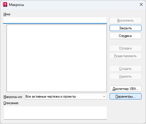 Задает проект или чертеж, макросы которого присутствуют в списке. Если пользовательский проект или чертеж не указан в списке, следует нажать левой кнопкой мыши на диспетчер VBA для загрузки проекта или чертежа.