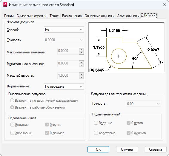 Устанавливает значение верхнего предельного отклонения. При включении опции "Симметрично" обоим отклонениям присваивается это значение. (системная переменная DIMTP)
