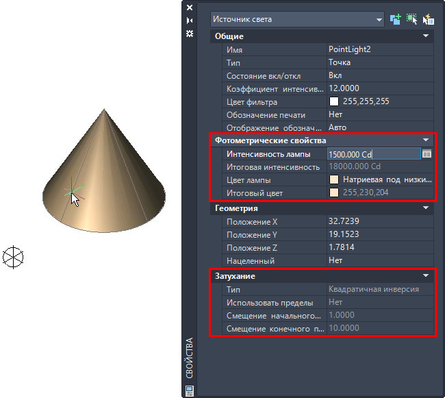 Ниже приведен пример точечного источника света с фотометрическими свойствами, выделенными на палитре свойств.