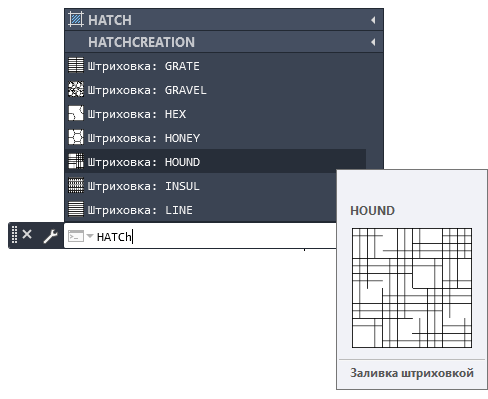 Пример. Предположим, требуется вставить образец штриховки. Если ввести штрих в командной строке и нажимать клавишу TAB для циклического перебора параметров командной строки, список вариантов будет расширяться доступными образцами штриховки. Переместите полосу прокрутки для отображения дополнительных штриховок и градиентов. Можно просмотреть миниатюру каждого параметра, наведя курсор на имя.