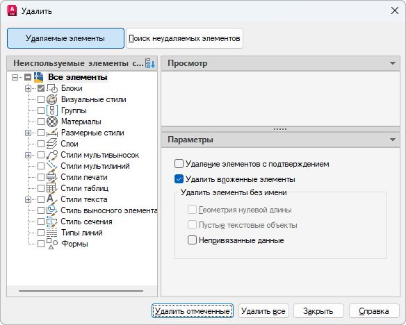 Отображение списка элементов в текущем чертеже, которые можно удалить, на панели дерева слева. Дополнительные элементы можно удалить из чертежа на панели удаления объектов без имени в правой части диалогового окна.