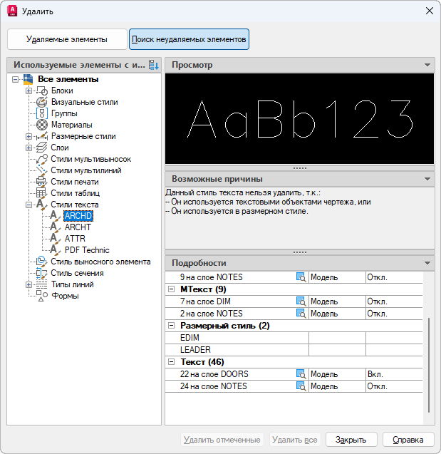 Чаще всего такие объекты либо используются в чертеже, либо являются стандартными элементами, удаление которых запрещено. Когда выбираются отдельные именованные объекты, выводится информация о том, почему нельзя удалить выбранный элемент.
