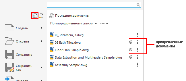 В списке "Последние документы" отображаются недавно использовавшиеся файлы, причем по умолчанию список открывается последним сохраненным файлом.