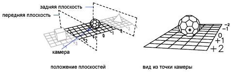 На видах можно устанавливать переднюю и заднюю секущие плоскости, чтобы отображались только объекты, расположенные в пределах определенного расстояния от камеры. Секущие плоскости можно перемещать, сохраняя их нормальное положение относительно линии, соединяющей цель с направленной на нее камерой. Отображение объектов, которые расположены вне пространства между этими плоскостями, подавляется. Следующий чертеж иллюстрирует работу с секущими плоскостями: