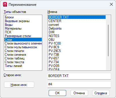 Изменение имен, назначенных таким именованным объектам, как слои и размерные стили.