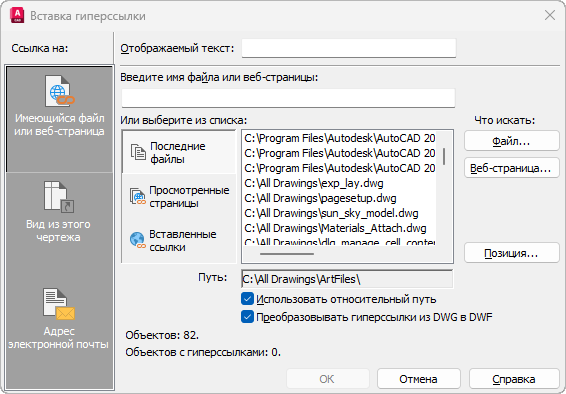 Выбор между использованием относительного и полного пути для гиперссылок. При выборе этого параметра в гиперссылке не сохраняется полный путь к связанному с ней файлу. Для относительного пути устанавливается значение, указанное в системной переменной HYPERLINKBASE, или, если этой переменной не присвоено никакого значения, относительный путь определяется как путь к текущему чертежу. Если этот параметр не выбран, в гиперссылке сохраняется полный путь к связанному с ней файлу.