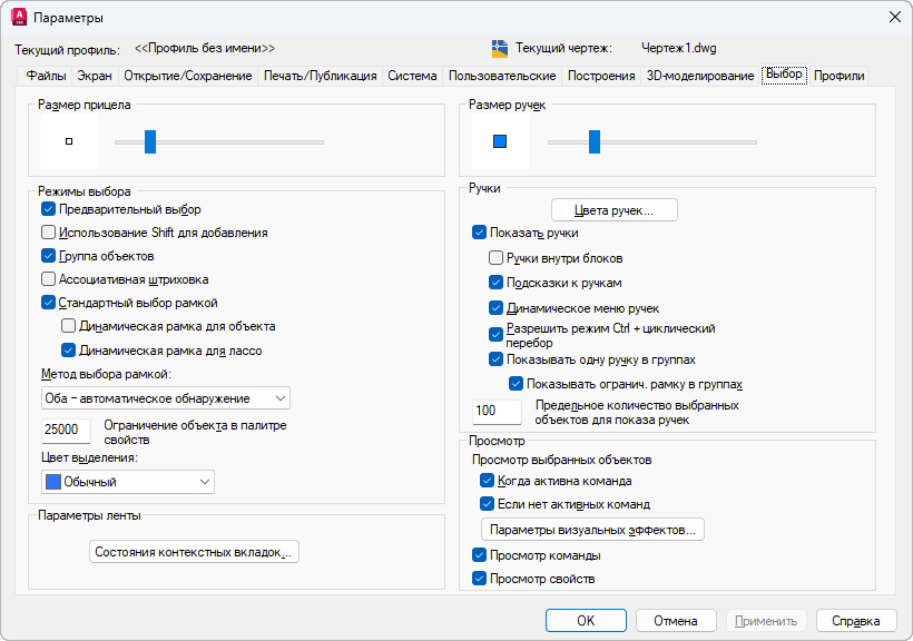 Отображает выбранные элементы для предварительного просмотра, если ни одна команда не активна. (системная переменная SELECTIONPREVIEW)