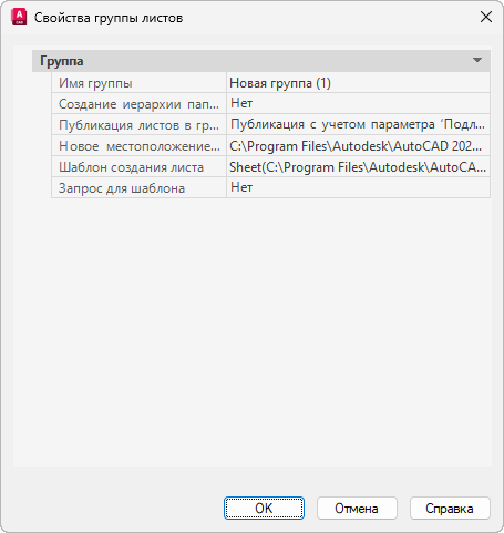 Задание файла шаблона чертежей (DWT) и имени листа в нем, на основе которого создаются новые файлы чертежей для данной группы.
