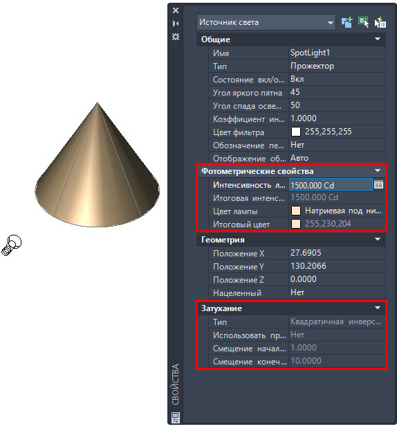 Прим.: При использовании в чертеже фотометрических единиц свойство "Тип затухания" отключается. Фотометрические источники света имеют фиксированное затухание в соответствии с обратной квадратической зависимостью. Спад освещенности светового пятна в визуализированном изображении отличается от стандартного освещения, так как для его вычисления применяются другие математические формулы.