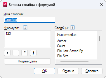 Отображает имена столбцов, из которых извлекаются данные чертежа и внешние данные (если было установлено связывание данных). Чтобы имена столбцов могли быть добавлены к области "Формула" или перемещены путем перетаскивания из списка столбцов в область "Формула", нужно дважды щелкнуть на этих именах. Существующие столбцы с формулами не вносятся в список и не могут использоваться в качестве значений для создания дополнительных столбцов с формулами.
