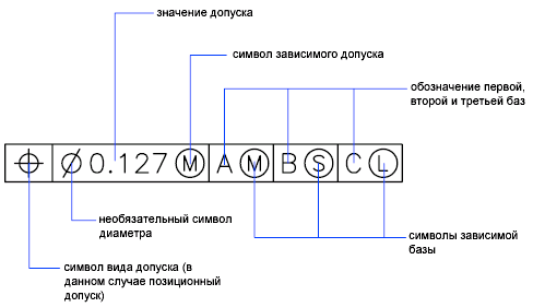 Рамка допуска формы и расположения состоит, по меньшей мере, из двух частей. В первой находится графический обозначение, обозначающий вид допуска (формы, расположения, сечения, биения и т.п.). Допуски формы подразделяются на допуски прямолинейности, плоскостности, округлости, цилиндричности и профиля продольного сечения. На чертеже обозначен позиционный допуск.