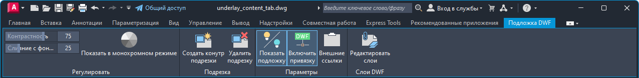 Если в чертеже выбрана подложка DWF , на ленте отображается контекстная вкладка "Подложка DWF".