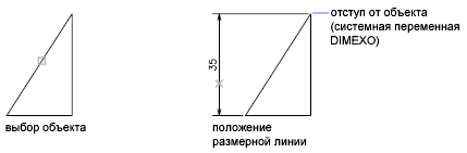 При выборе отрезка или дуги конечные точки объекта используются в качестве начальных точек выносных линий. Их отступ от объекта определяется значением параметра "Отступ от объекта" на вкладке "Линии и стрелки" диалоговых окон работы с размерными стилями. См. команду РЗМСТИЛЬ. Это значение хранится в системной переменной DIMEXO.