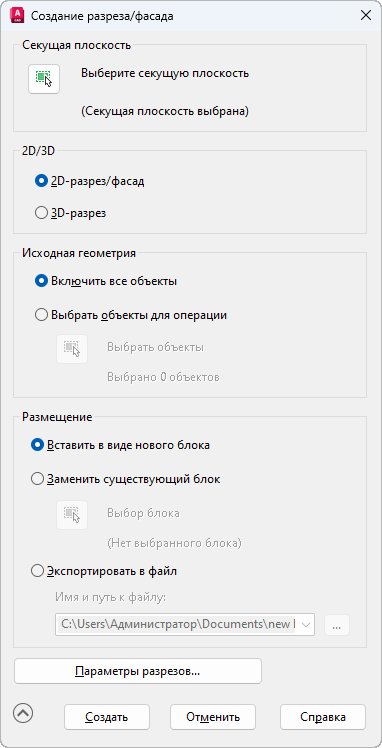 Вставка созданного сечения в текущий чертеж в качестве блока.