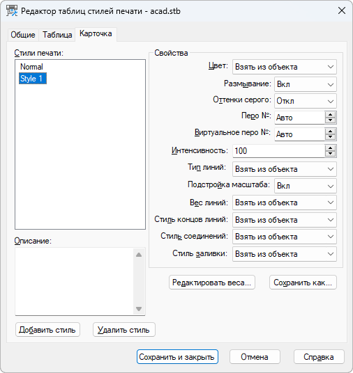Стили печати отображаются каждый в отдельном столбце, слева направо. Как правило, если количество стилей печати невелико, удобнее пользоваться вкладкой "Таблица". При большом количестве стилей предпочтительнее работать на вкладке "Карточка". На ней все имеющиеся стили перечислены в списке в левой части, а правая часть занята описанием свойств одного выбранного стиля. Стиль NORMAL расположен в начале таблицы именованных стилей печати и является свойством по умолчанию для объектов (стиль печати не назначен). Стиль NORMAL нельзя изменить или удалить.