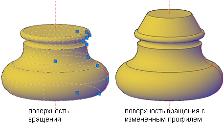 Для тел и поверхностей, созданных методом вращения, отображаются ручки на профиле вращения в начале тела (поверхности), построенного методом вращения. Можно использовать эти ручки для изменения профиля тела или поверхности.