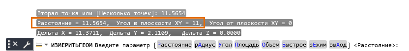 Измерения отображаются в командном окне. При необходимости нажмите клавишу F2, чтобы развернуть командное окно.