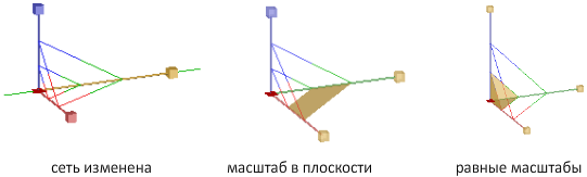 Масштабирование объекта-сети связывается зависимостью с определенной плоскостью. Каждая плоскость определяется полосой, проходящей от внешних концов ручек соответствующей оси. Плоскость масштабирования задается наведением курсора на одну из полос. Когда цвет полосы изменится на желтый, щелкните на ней мышью.