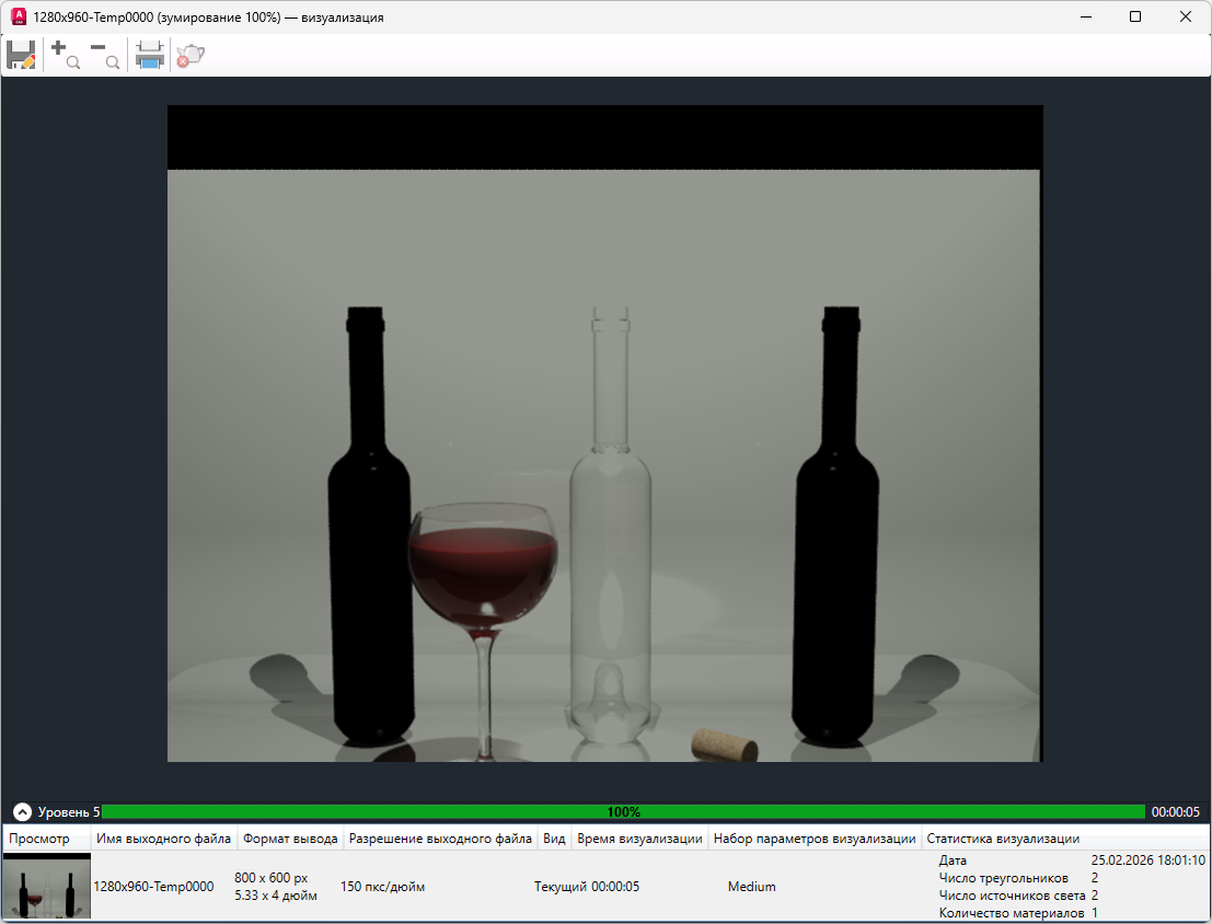 • Статистика визуализации. Дата и время создания визуализированного изображения, количество объектов в визуализированном виде. В число объектов входят геометрия, источники освещения и материалы.
