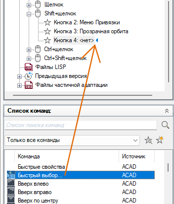 Перетащите команду, которую требуется добавить, с панели "Список команд" на кнопку мыши на панели "Адаптации: