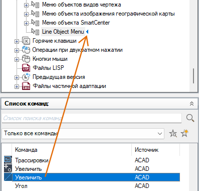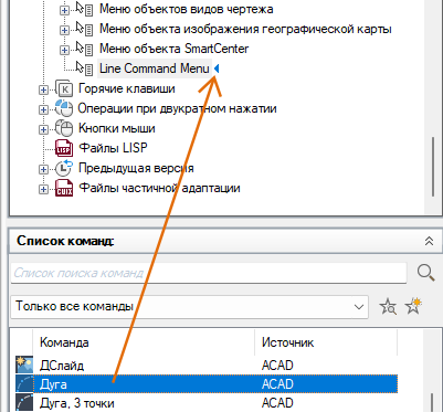 Чтобы вставлять параметры меню, относящиеся к активной команде в контекстном меню, необходимо использовать псевдоним COMMAND_имя_команды. Текст имя_команды может являться именем любой команды. Например, если требуется отображать опции меню в контекстном меню при работе с командой ОТРЕЗОК, можно использовать псевдоним СТРОКА_ОТРЕЗОК.