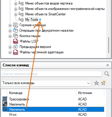 - Перетащите команду, которую требуется добавить, с панели "Список команд" в контекстное меню, расположенное на панели "Адаптации: <имя файла>".