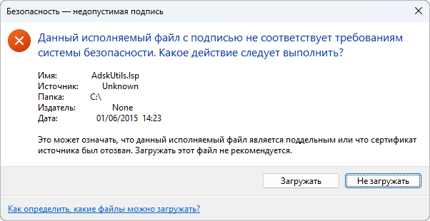 При загрузке файла пользовательской программы с цифровой подписью AutoCAD LT или программа на основе AutoCAD проверяет цифровую подпись, добавленную к файлу. Отображается сообщение о проверке цифровой подписи, которое позволяет пользователю загружать или не загружать файл программы в среду чертежа.